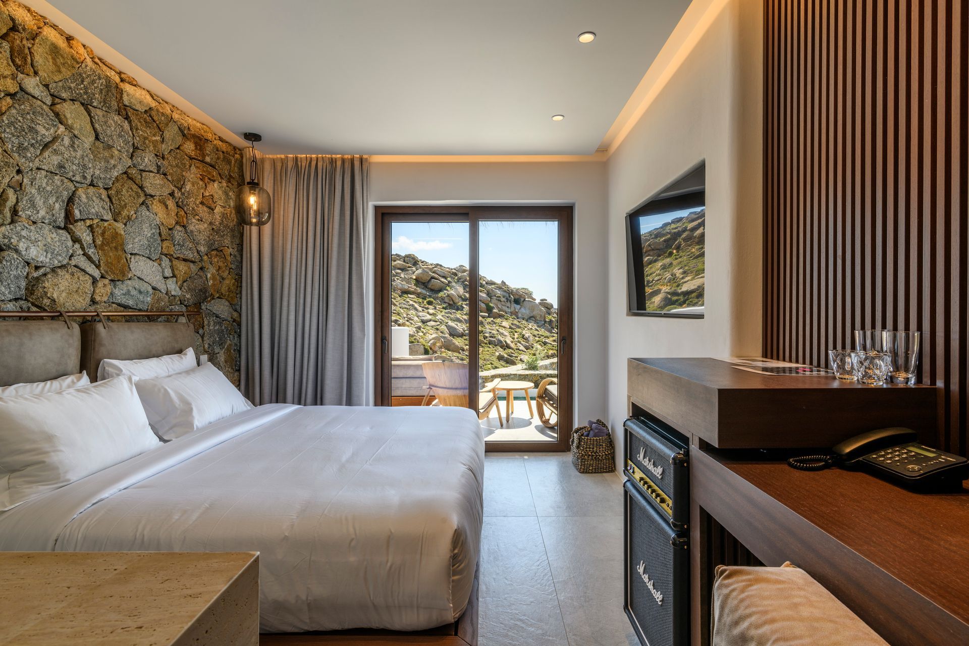 The Sea View Suite is your private sanctuary above the Aegean. Wake to sweeping views of crystalline blue waters, unwind on your elegantly appointed balcony, and slip into your own plunge pool as the Mykonian sun sets the horizon ablaze. This is Mykonos at its most indulgent. Each suite features a spacious balcony, perfectly positioned to soak in the endless sea views.